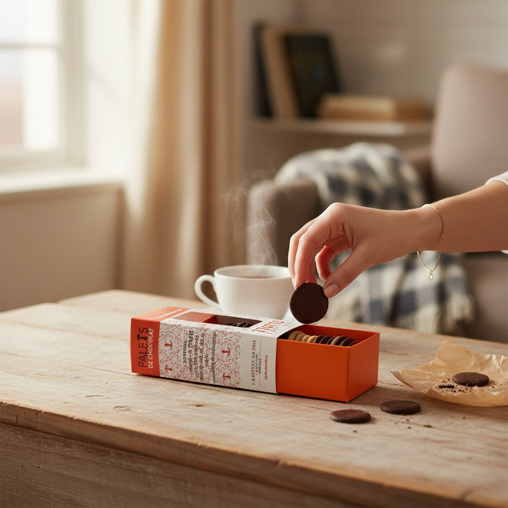 Idéal pour accompagner votre café, le palet de chocolat est le petit plaisir tout en douceur !