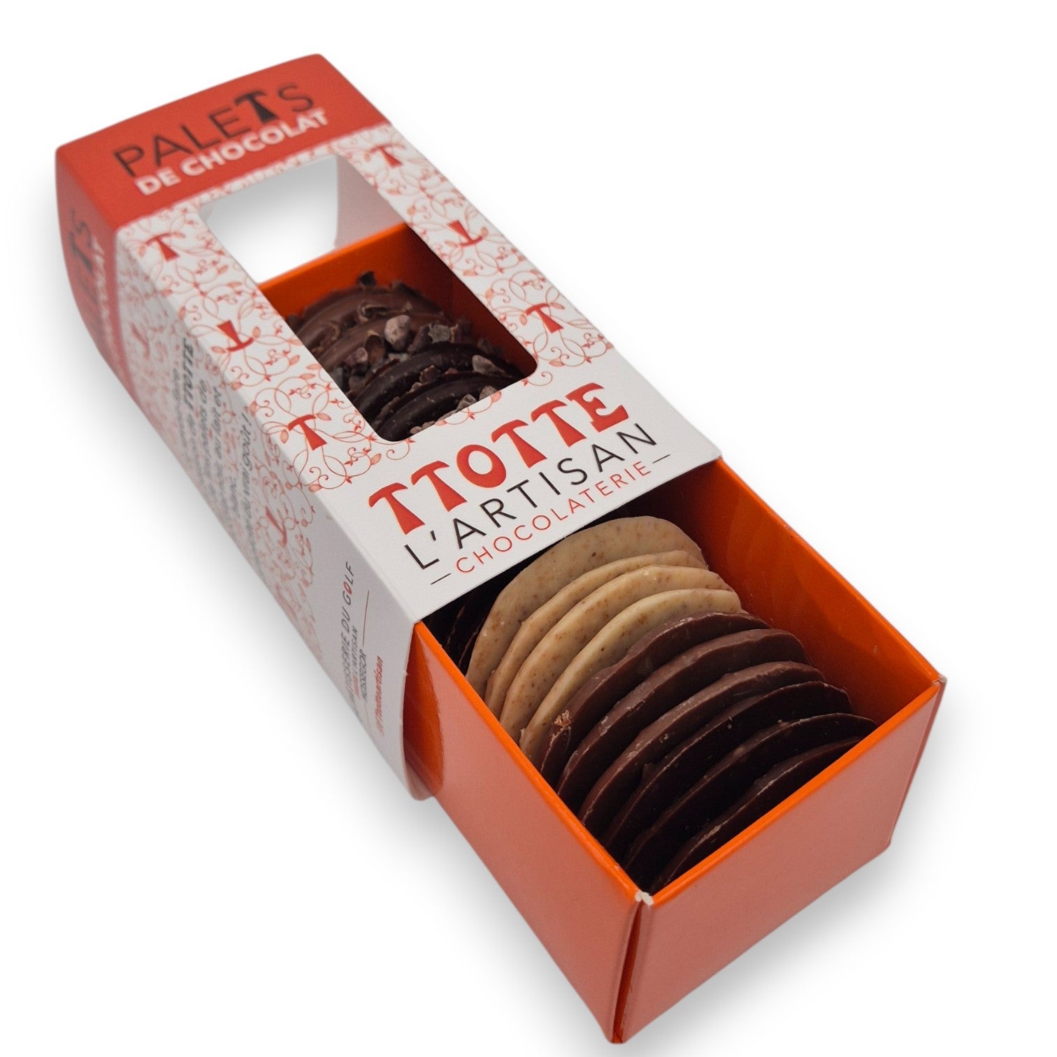 Passionné de chocolat, Ttotte voulait créer une gourmandise qui magnifiait le goût de cette matière noble ! Il a créé le palet de chocolat : un disque  de bon chocolat associé ou non à des matières premières de qualité ! La simplicité du vrai goût ! Retrouvez un assortiment de fins palets de chocolat noir, au lait ou blanc composé de nos palets "natures", de nos palets "croustillants", de notre palet au grué de cacao et de notre palet "caramélito".