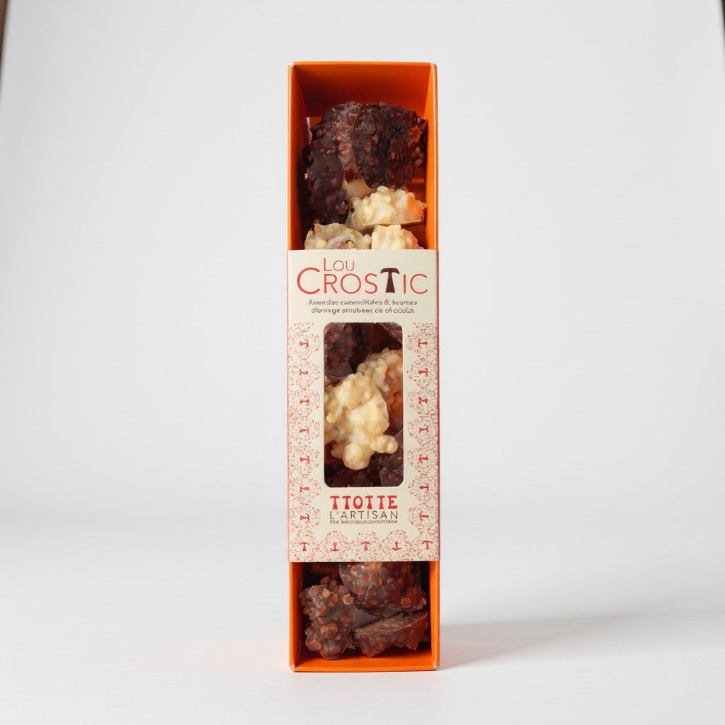 IngrédientsChocolat noir 68% de cacao (fèves de cacao, sucre, beurre de cacao, lécithine de soja, extrait naturel de vanille), et/ou chocolat au lait 36% (sucre, beurre de cacao, poudre de lait entier, lait écrémé en poudre, pâte de cacao, lécithine de soja), et/ou chocolat blanc (sucre, beurre de cacao, lait entier en poudre, lécithine de soja, extrait naturel de vanille), amandes effilées, oranges confites (orange, sucre).
