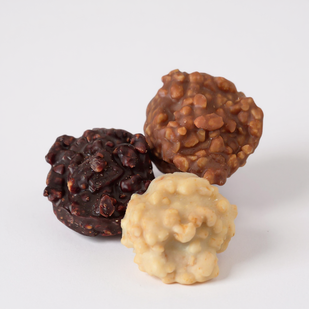 Découvrez le rocher gascon : Des amandes caramélisées et dès d'oranges confites délicatement enrobées de chocolat noir, au lait ou blanc.